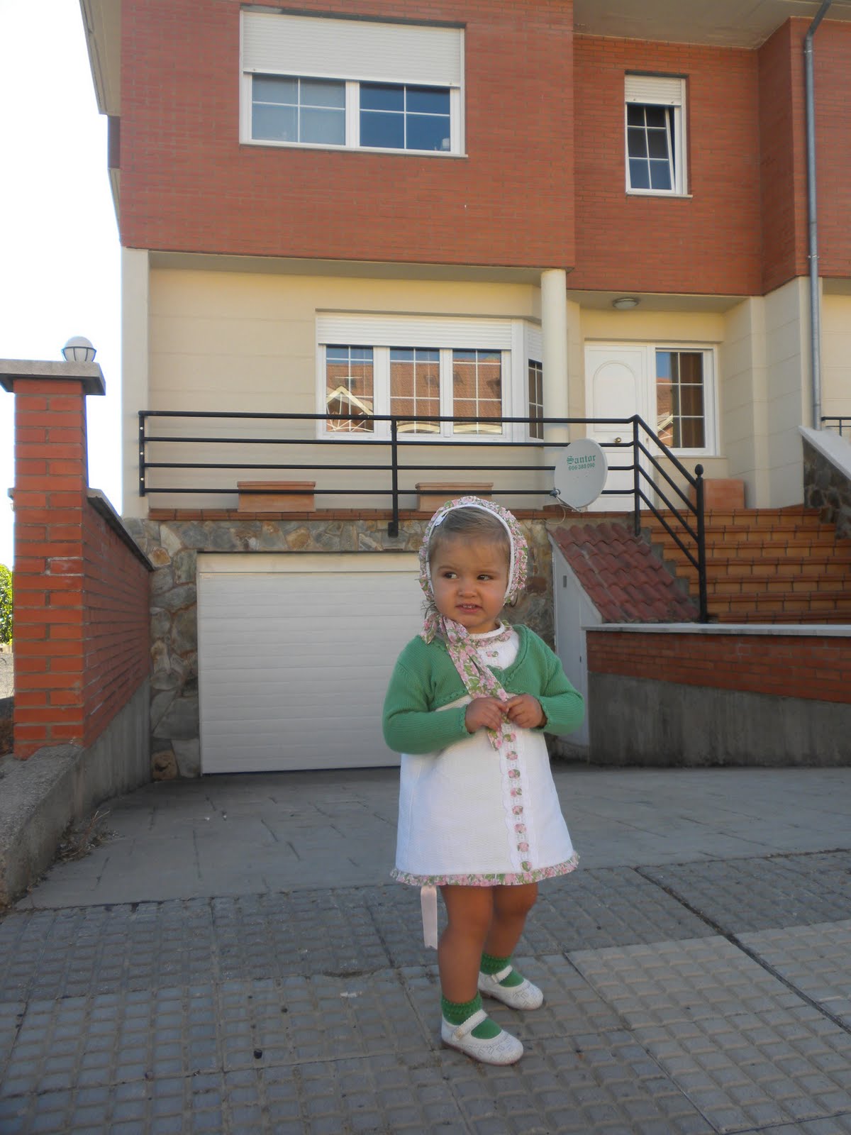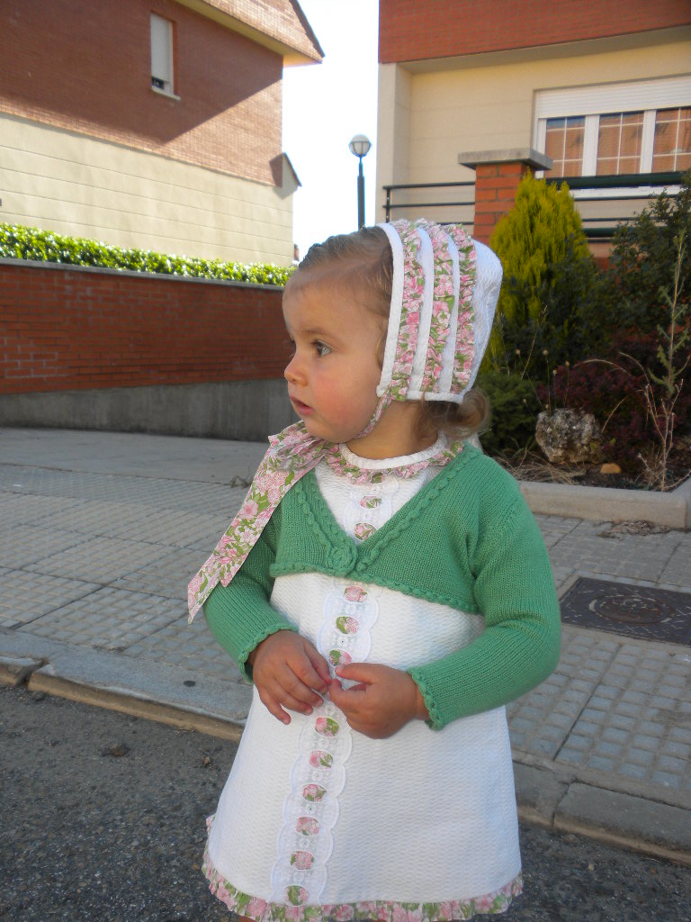 La he convinado el vestido con calcetines y chaqueta verde …. también se la ponía con zapatos, calcetines y chaqueta rosa pero he tenido un desliz con la chaqueta de pili carrera rosa y ha quedado para un bebe de 1 mes…..esta secadora prepara a veces cada cosaaaaaaaaaa….